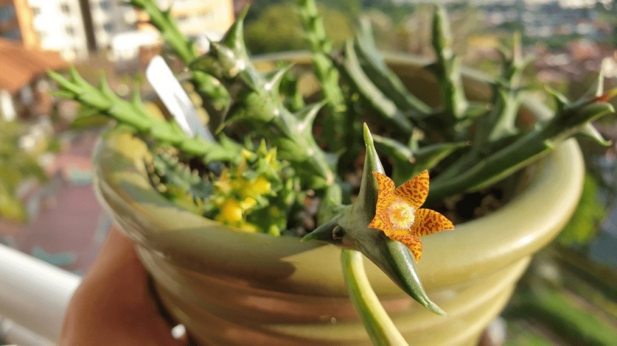 Những bông hoa da báo tinh tế có thân thịt dày đặc, leo và mọc, với thân cây màu xám, kèm theo sọc màu xanh đậm hoặc tím, 4 cạnh, gai ngắn và đế dài.