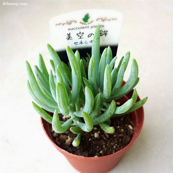 Blue Moon Senecio Antandroi Cây mọng nước của gia đình Asteraceae, có nguồn gốc từ Madagascar, Nam Phi. Tên sớm nhất của nó là Green Rose/Mei Kong Rose (“” “được phát âm là” “và” “”). Hình dạng mặt trăng màu xanh hơi giống với cây thông màu xanh, nhưng lá dài hơn. Lá của mặt trăng xanh là tuyến tính, được phân cụm trên thân cây, màu xanh lá cây đến xanh lam, hồng, với các đường thẳng đứng thấm trên lá và thân cây phát triển thẳng đứng.